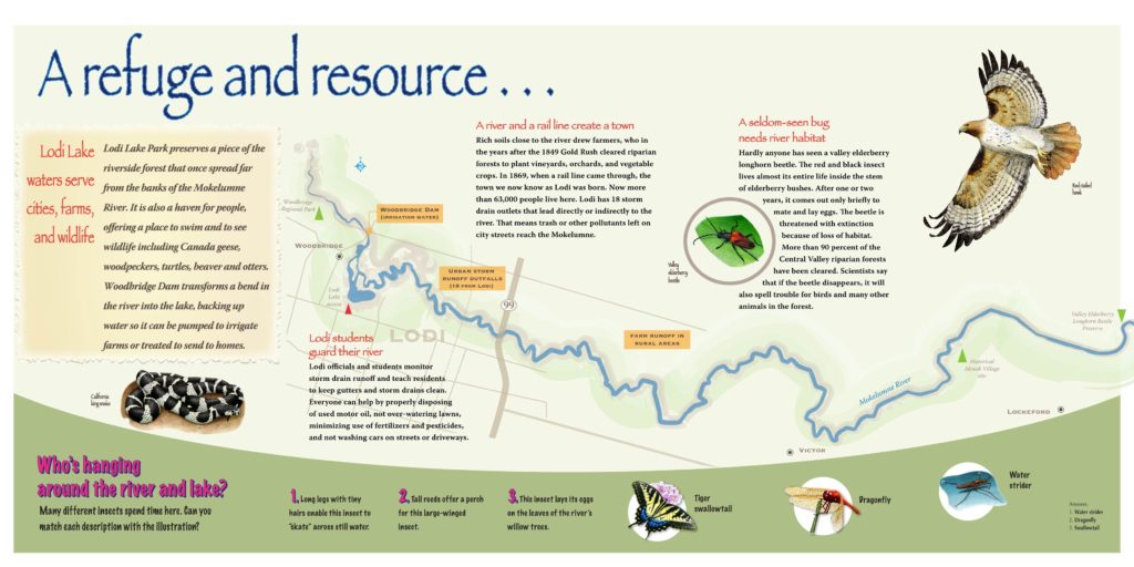Signage featuring illustrations of various animals native to the areas around Lodi Lake in California
