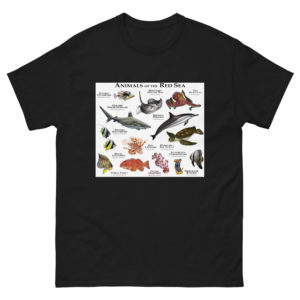 Fine art illustration of some of the marine animals native to the Red Sea printed on a high-quality men's t-shirt. Species featured: BLOTCHED FANTAIL RAY (Taeniura meyeni) CORAL TROUT (Plectropomus leopardus) DAY OCOTOPUS (Octopus cyanea) ELIZABETH’S CHROMODORIS (Chromodoris elisabethina) HAWKSBILL SEA TURTLE (Eretmochelys imbricata) OCEANIC WHITETIP SHARK (Carcharhinus longimanus) ORBICULAR BATFISH (Platax orbicularis) PICASSO TIGGERFISH (Rhinecanthus aculeatus) PYGMY SEAHORSE (Hippocampus bargibanti) RED LIONFISH (Pterois volitans) RED SEA BANNERFISH (Heniochus intermedius) REGAL ANGELFISH (Pygoplites diacanthus) SPINNER DOLPHIN (Stenella longirostris)