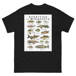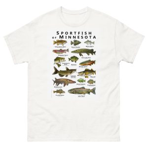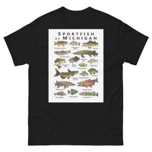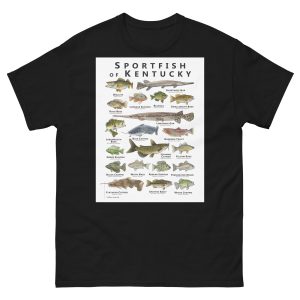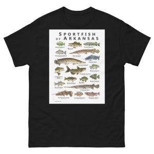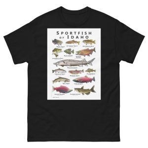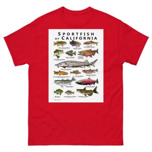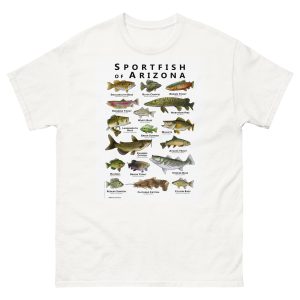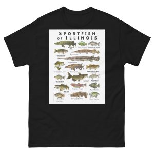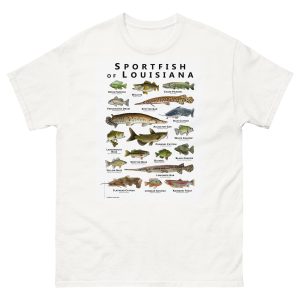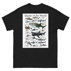 A colorful collage of scientifically accurate illustration of various species of shark. The layout features over twenty different types of sharks, including some of the world’s most endangered species printed on a high-quality 100% men's cotton t-shirt.