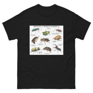 Beetles (Order Coleoptera) are some of the most successful and widespread species of insect on the planet. There are some 350,000 species that have been identified, and are therefore the largest group of animals on earth. In the United States, there are almost 30,000 kinds of beetles. This images features fine art illustrations of various species of beetle (Coleoptera) native to North America on a high-quality t-shirt.