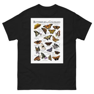 There are about 17,500 species of butterflies in the world, and around 750 species in the United States. This artwork features high-quality illustrations of the various species of butterfly native to the state of Colorado in the USA. The image is printed on a high-quality 100% men's cotton t-shirt.