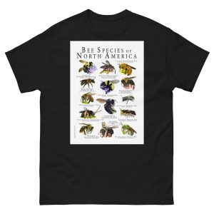 The poster print features a fine art illustration of various species of North America bee , along with a range map showing their distribution and information about each different species. The image is printed on a high-quality 100% men's cotton t-shirt.