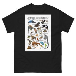 A colorful collage of scientifically accurate illustration of all various species of wildlife native to the reefs of the island of Madagascar in Africa. The layout features over twenty different animals, including some of the world’s most endangered species printed on a high-quality men's cotton t-shirt.