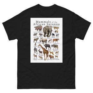 There are over 6000 species of mammals alive today. About 1000 of these species are native to the continent of Africa. This poster features a sampling of a few of the better known species printed on a high-quality 100% men's cotton t-shirt.