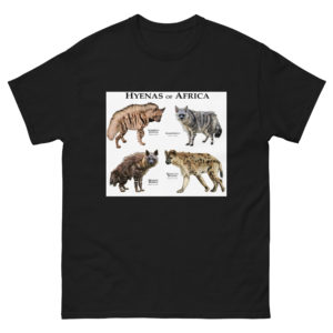 Fine art illustration of all extant species of hyena (Hyaenidae) printed on a high-quality men's cotton t-shirt