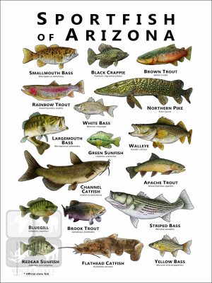 APACHE TROUT (Oncorhynchus apache) • BLACK CRAPPIE (Pomoxis nigromaculatus) • BLUEGILL (Sebastes caurinus) • BROOK TROUT (Salvelinus fontinalis) • BROWN TROUT (Salmo trutta) • CHANNEL CATFISH (Ictalurus punctatus) • FLATHEAD CATFISH (Pylodictis olivaris) • GREEN SUNFISH (Lepomis cyanellus) • LARGEMOUTH BASS (Micropterus salmoides) • NORTHERN PIKE (Esox lucius) • RAINBOW TROUT (Oncorhynchus mykiss) • REDEAR SUNFISH (Lepomis microlophus) • SMALLMOUTH BASS (Micropterus dolomieu) • STRIPED BASS (Morone saxatilis) • WALLEYE (Sander vitreus) • WHITE BASS (Morone chrysops) • WHITE CRAPPIE (Pomoxis annularis) • YELLOW BASS (Morone mississippiensis)