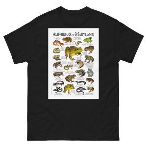 There are roughly 230 species of amphibians found in the continental United States. This includes about 190 species of salamanders and newts, with 90 species of frogs and toads. They're generally found in streams, bogs, rivers, ponds, lakes, vernal pools and forests. This artwork features high-quality illustrations of the various species of amphibians native to the state of Maryland in the USA. The image is printed on a high-quality 100% men's cotton t-shirt.
