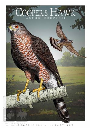 This poster features an informational graphic of the Cooper's Hawk. It includes a map of the hawk's range, along with three illustrations and a small paragraph with information about this species of hawk. The poster is printed on matte, museum-quality paper with Giclée printing quality: • Paper thickness: 10.3 mil • Paper weight: 5.6 oz/y² (192 g/m²) • Opacity: 94% • Ships in 2-5 days All images are scientifically accurate and expertly drawn by wildlife artist Roger Hall.