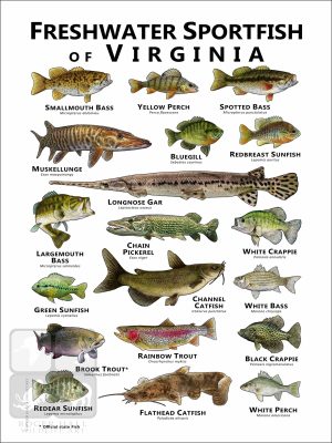 BLACK CRAPPIE (Pomoxis nigromaculatus) • BLUEGILL (Sebastes caurinus) • BROWN TROUT (Salmo trutta) • CHAIN PICKEREL (Esox niger) • CHANNEL CATFISH (Ictalurus punctatus) • FLATHEAD CATFISH (Pylodictis olivaris) • GREEN SUNFISH (Lepomis cyanellus) • LARGEMOUTH BASS (Micropterus salmoides) • LONGNOSE GAR (Lepisosteus osseus) • PUMPKINSEED (Lepomis gibbosus) • RAINBOW TROUT (Oncorhynchus mykiss) • REDBREAST SUNFISH (Lepomis auritus) • SMALLMOUTH BASS (Micropterus dolomieu) • SPOTTED BASS (Micropterus punctulatus) • SOUTHERN APPALACHIAN BROOK TROUT (Salvelinus fontinalis) • STRIPED BASS (Morone saxatilis) • WHITE PERCH (Morone americana) • YELLOW PERCH (Perca flavescens)