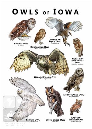 The state of Iowa in North America has nine native species of owl. They're all here on this poster, drawn beautifully and with amazing scientific accuracy. The owl species included: