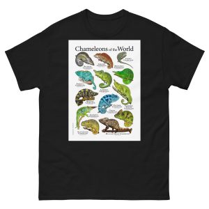 A colorful collage of scientifically accurate illustration of various species of chameleon. The layout features thirteen different types of chameleon, including some of the world’s most vulnerable species printed on a high-quality 100% men's cotton t-shirt..