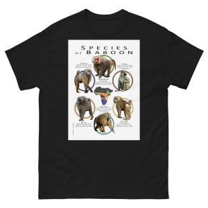 A colorful collage of scientifically accurate illustration of all species of baboon. The image is printed on a high-quality 100% men’s cotton t-shirt.
