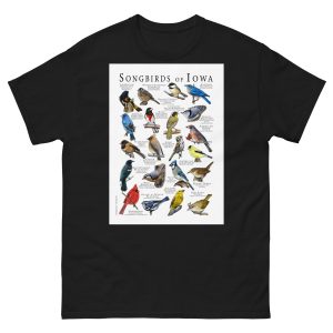 Songbirds - also known as the passerine birds - are any member of the suborder Passeri (or Oscines), of the order Passeriformes. The group including about 4,000 species in 35-55 families, which is nearly half the world’s birds. This artwork features high-quality illustrations of the various species of songbird native to the state of Iowa in the USA. The image is printed on a high-quality 100% men's cotton t-shirt.