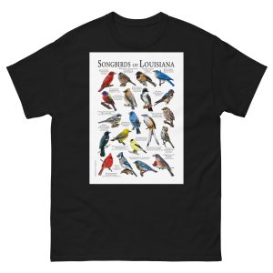 Songbirds - also known as the passerine birds - are any member of the suborder Passeri (or Oscines), of the order Passeriformes. The group including about 4,000 species in 35-55 families, which is nearly half the world’s birds. This artwork features high-quality illustrations of the various species of songbird native to the state of Louisiana in the USA. The image is printed on a high-quality 100% men's cotton t-shirt.