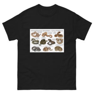 The state of California is home to many amazing species of venomous snake. On this artwork -print are images all of these species. This covers all genus currently living and native to the state of California printed in a high-quality men's cotton t-shirt.