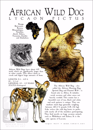This poster features an informational graphic of the African Painted Dog. It includes a map of the animal's range, along with three illustrations and a small paragraph with information about this endangered canine.