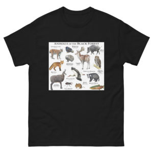 Fine art illustration of various species of animals native to the Black Forest in Germany printed on a high quality men's t-shirt