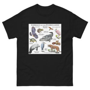 Fine art illustration of some of the animals and wildlife native to the Florida Everglades on a high-quality men's t-shirt
