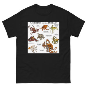 In the world's oceans there are over three-hundred species of octopus. The range in size from less than 1/2 inch to 30 feet across. They are found from the coastlines all the way down to some of the deepest parts of the ocean. They are highly intelligent and use camouflage to avoid detection. This artwork features fine art illustrations of various species of octopus (Octopoda) printed on a high-quality, men's cotton t-shirt.