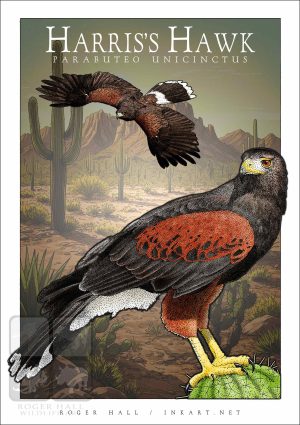 The Harris's Hawk is a medium-large sized buteo found in semi-arid brush habitats from the southwestern US through Central America an into the drier area of South America. Unlike other raptors Harris Hawks will often remain with the family unit for a few years, helping to raise newborns and hunt cooperatively with other family members. This bird is very intelligent and can be trained, and because of this it is a very popular bird with falconers. The poster is printed on matte, museum-quality paper with Giclée printing quality: • Paper thickness: 10.3 mil • Paper weight: 5.6 oz/y² (192 g/m²) • Opacity: 94% Buy a Digital Download