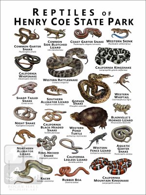 AQUATIC GARTER SNAKE (Thamnophis atratus) • BLAINVILLE’S HORNED LIZARD (Phrynosoma blainvillii) • CALIFORNIA BLACK-HEADED SNAKE (Tantilla planiceps) • CALIFORNIA LEGLESS LIZARD (Anniella pulchra) • CALIFORNIA KINGSNAKE (Lampropeltis getula californiae) • CALIFORNIA MOUNTAIN KINGSNAKE (Lampropeltis zonata) • CALIFORNIA WHIPSNAKE (Masticophis lateralis) • COAST GARTER SNAKE (Thamnophis elegans terrestris) • COMMON GARTER SNAKE (Thamnophis sirtalis) • COMMON SIDE-BLOTCHED LIZARD (Uta stansburiana) • GOPHER SNAKE (Pituophis catenifer) • NIGHT SNAKE (Hypsiglena torquata) •NORTHERN ALLIGATOR LIZARD (Elgaria coerulea) •RACER (Coluber constrictor) •RING-NECKED SNAKE (Diadophis punctatus) •RUBBER BOA (Charina bottae) •SHARP-TAILED SNAKE (Contia tenuis) • SOUTHERN ALLIGATOR LIZARD (Elgaria multicarinata) • WESTERN FENCE LIZARD (Sceloporus occidentalis) • WESTERN POND TURTLE (Actinemys marmorata) • WESTERN RATTLESNAKE (Crotalus oreganus) • WESTERN SKINK (Plestiodon skiltonianus) • WESTERN WHIPTAIL (Cnemidophorus tigris)