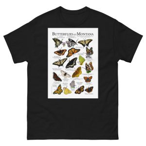 There are about 17,500 species of butterflies in the world, and around 750 species in the United States. This artwork features high-quality illustrations of the various species of butterfly native to the state of Montana in the USA. The image is printed on a high-quality 100% men's cotton t-shirt.