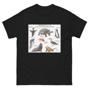 The islands of the Galapagos are like no others on the planet. There are fifty-six species of native land animals – and twenty-seven of these are found only there. This image features fine art illustrations of various animals of the Galapagos Islands printed on a high-quality men’s t-shirt