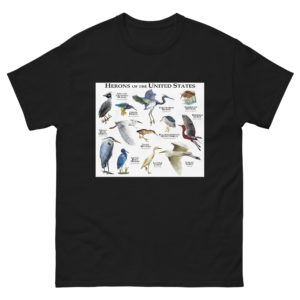 This artwork features fine art illustrations of all twelve extant species of heron native to the USA printed on a high-quality men's t-shirt.