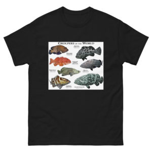 There are 159 species of Groupers in the world's oceans. They range in size from just a few inches long to the Giant Grouper which can grow to over 8 feet long. Several of these species of Grouper are endangered due to over fishing. This artwork features fine art illustrations of various species of Grouper fish (Epinephelinae) printed on a high-quality men's cotton t-shirt.
