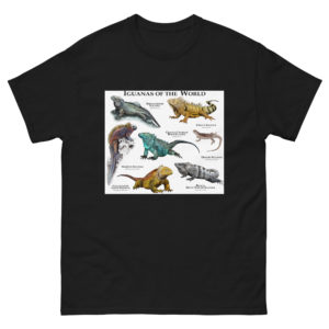 There are 35 species of iguana in the world. Most of them live in warm, tropical areas near the equator. Despite some species moving into areas where they're not native to (such as the Green, Black-Tailed and Mexican iguana in Floirda) iguana are some of the most endangered reptiles on the planet, due to habitat loss. This artwork features fine art illustrations of various species of iguana printed on a high-quality men's cotton t-shirt.