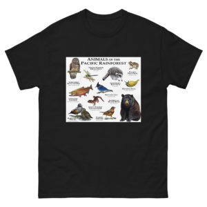 Fine art illustration of some of the wildlife native to the Pacific Rainforest printed on a high-quality men's t-shirt