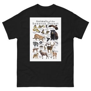Fine art illustration of some of the animals native to the Sonoran Desert printed on a high-quality men's cotton t-shirt