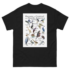 There are sixteen species of heron native to North America (Canada, United States and Mexico.) They can be found in a variety of environments, such as mangrove swamps, flooded meadows, lake edges, riverbanks, ocean shorelines, and fresh & saltwater marshes and even urban areas like parks and open fields. The layout print features illustrations of all native species of heron in North and Central America printed on a high-quality 100% men's cotton t-shirt.
