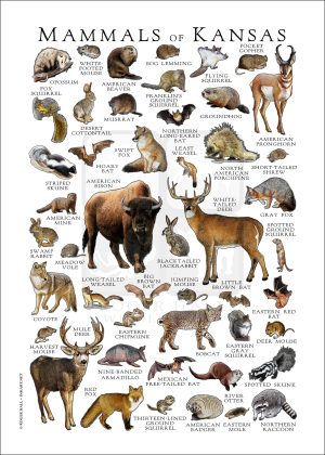 The state of Kansas is home to many amazing mammals. On this poster-print are many of them, including all genus currently living and native to the state.