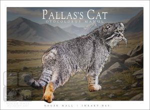 Pallas's CatPallas's cat also called the manul, is a small wild feline native to the in the grasslands and montane steppe of Central Asia. It is about the size of a domestic cat. The combination of its stocky posture and long, dense fur makes it appear stout and plush. The legs are proportionately shorter than those of other cats, the ears are set very low and wide apart, and it has unusually short claws. The face is shortened compared with other cats, giving it a flattened face. Like other wild cats, they are mostly solitary animals, with both males and females marking their territories with scent marks. These cats spend the day in caves, rock crevices, or marmot burrows, and emerge in the late afternoon to begin hunting. They are not fast runners, and hunt primarily by ambush or stalking, using low vegetation and rocky terrain for cover. They feed largely on diurnally active prey species such as gerbils, pikas, voles and chukar partridges, and sometimes catch young marmots. Pallas's cat was named after the German naturalist Peter Simon Pallas, who first described the species in 1776 under the binomial Felis manul. There are three recognized sub-species, all found in Asia.The poster is printed on matte, museum-quality paper with Giclée printing quality:
