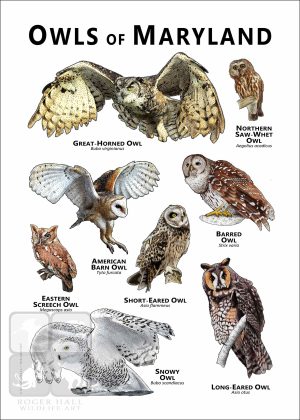 The state of Maryland in North America has eight native species of owl. They're all here on this poster, drawn beautifully and with amazing scientific accuracy. The owl species included: