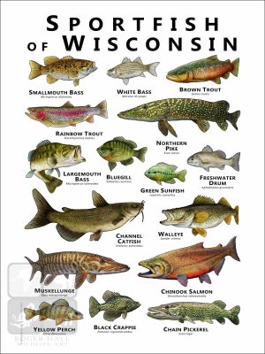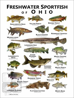 BLACK CRAPPIE (Pomoxis nigromaculatus) • BLUEGILL (Sebastes caurinus) • BROWN TROUT (Salmo trutta) • CHANNEL CATFISH (Ictalurus punctatus) • CHAIN PICKEREL (Esox niger) • CHINOOK SALMON (Oncorhynchus tshawytscha) • FRESHWATER DRUM (Aplodinotus grunniens) • GREEN SUNFISH Lepomis cyanellus • LARGEMOUTH BASS (Micropterus salmoides) • MUSKELLUNGE (Esox masquinongy) • NORTHERN PIKE (Esox lucius) • RAINBOW TROUT (Oncorhynchus mykiss) • SMALLMOUTH BASS (Micropterus dolomieu) • WALLEYE (Sander vitreus) • WHITE BASS (Morone chrysops) • YELLOW PERCH (Perca flavescens)
