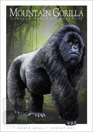 Mountain Gorillas are one of two subspecies of Eastern Gorilla. These large and powerful primates are only be found in four national parks of the Virunga Mountains in Central Africa. While these animals are very strong, they are also generally gentle and shy. They live in groups of 2-40 individuals, averaging about 11. Wild male gorillas can weigh up to 300 to 400 pounds (135 to 180 kg) while females are usually about half that size. Adult males are roughly 5.5 feet tall (1.68 meters) with an arm span or from 7.5 to 8.5 feet (2.3 to 2.6 meters). Female gorillas are somewhat shorter with smaller arm spans. Groups are led by a dominant male called a 'Silverback'. The Mountain Gorilla is a herbivore that eats over 100 different species of plants. They are critically endangered due to habitat loss, poaching and decades of civil war in the areas they live. As of Spring in 2010 their entire population in the wild was estimated to be less than 800 individuals. Gorillas can be identified by their nose prints, which are unique to each animal. The poster is printed on matte, museum-quality paper with Giclée printing quality: • Paper thickness: 10.3 mil • Paper weight: 5.6 oz/y² (192 g/m²) • Opacity: 94% Buy a Digital Download