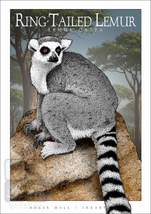 Ring-Tailed Lemurs inhabit southern and southwestern Madagascar, with an additional population on the southeastern plateau of the Andringita Mountains. Lemurs spend most of their lives in trees, but they also spend considerable time on the ground, moving in a very distinctive hop. The Ring-Tailed Lemur is an average sized lemur, with a height of 15-18” inches with a tail length of 22-25” inches. They weigh about 5-7 pounds. This lemur takes its common name from the ringed pattern on the tail. Lemurs are prosimians which means "before apes" in Latin. The poster is printed on matte, museum-quality paper with Giclée printing quality: • Paper thickness: 10.3 mil • Paper weight: 5.6 oz/y² (192 g/m²) • Opacity: 94% Buy a Digital Download