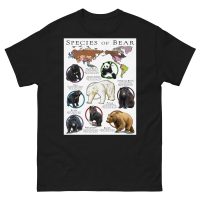 There are eight species of bears in existence today. They’re found many different environments on every continent (except Antarctica.) The poster print features a fine art illustration of all types of bears, along with a range map showing their distribution and information about each different species printed on a high-quality 100% men's cotton t-shirt.