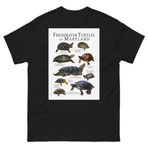 There are forty-nine species of turtles live in the United States and Canada, with the highest diversity in the Southeastern United States. This artwork features high-quality illustrations of the all freshwater turtles species native to the state of Maryland, printed in a high-quality men's cotton t-shirt.