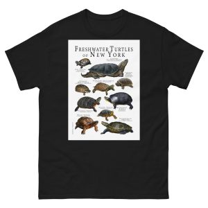 There are forty-nine species of turtles live in the United States and Canada, with the highest diversity in the Southeastern United States. This artwork features high-quality illustrations of the all freshwater turtles species native to the state of New York, printed in a high-quality men's cotton t-shirt.