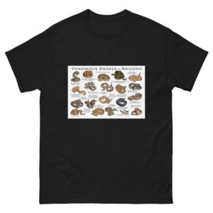 There are twenty species of venomous snakes found in the state of Arizona in the US. While these snakes might have fearsome reputations, on average only few people in die each year in the United States from snake bites. This artwork features fine art illustrations of the all venomous snake species native to Arizona printed in a high-quality men's cotton t-shirt.