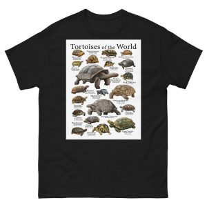 A colorful collage of scientifically accurate illustration of various species of tortoise. The layout features over twenty different types of tortoises, including some of the world’s most endangered species printed on a high-quality 100% men's cotton t-shirt..