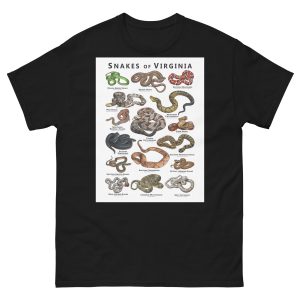 • Double seam at sleeves and bottom hemExpertly rendered illustrations of the snakes of Virginia. The artwork is printed on a high-quality 100% cotton tee. Many sizes & colors available!