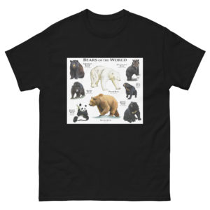 There are eight species of bears in existence today. They’re found many different environments on every continent (except Antarctica.) The poster print features a fine art illustration of all types of bears, along with a range map showing their distribution and information about each different species printed on a high-quality 100% men's cotton t-shirt.