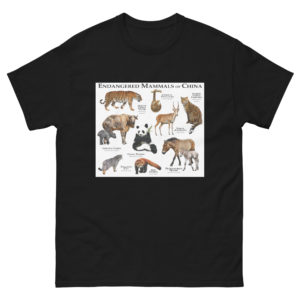 The nation of China is home to many highly endangered animals, many of which are found nowhere else on earth. This image features scientifically accurate illustrations of various species of endangered Chinese wildlife printed on a high-quality men's t-shirt.