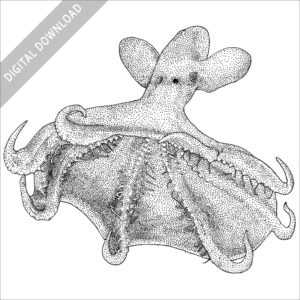 Fine art illustration of a Glowing Sucker Octopus (Stauroteuthis syrtensis.)
