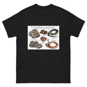 There are six species of venomous snakes found in the state of North Carolina in the US. While these snakes might have fearsome reputations, on average only few people in die each year in the United States from snake bites. This artwork features fine art illustrations of the all venomous snake species native to North Carolina printed in a high-quality men's cotton t-shirt.