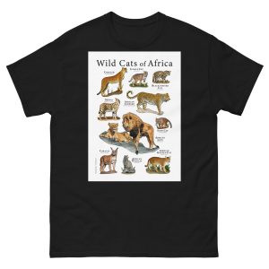 There are ten species of wild cat native to the continent of Africa. They’re found in a variety of environments including dense forests, arid savanna and grasslands. Several of the species are highly endangered, notably the lion which has lost 30 to 50 percent of its population in the last two decades alone. The layout features all ten living species of African wild cat printed on a high-quality 100% men’s cotton t-shirt.